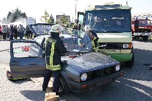 Noch während der Löscheinsatz auf vollen Touren läuft, kommt es auf der Landstraße, die an der Einsatzstelle vorbeiführt, zu einem Verkehrsunfall zwischen einem Kleinbus und einem Pkw. Zahlreiche Insassen werden verletzt, der Fahrer des Wagens ist eingeklemmt. Glücklicherweise ist auch der Unfall geplant und gehört zur Übung, fünf Statisten mimen die verletzten Fahrzeuginsassen. Unterstützt von Kameraden aus Eppelborn und Macherbach übernimmt der Löschbezirk Bubach-Calmesweiler diesen Teil der Übung.