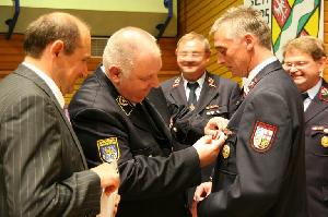 Ein Festkommers in der Wiesbachhalle mit großem Zapfenstreich und ein Festumzug durch Wiesbach waren weitere Höhepunkte der Feierlichkeiten. Bürgermeister Fritz-Hermann Lutz begrüßte vor dem großen Kommers die Vertreter der Wehren und Kommunalpolitiker aus dem Landkreis Neunkirchen in der Wiesbachhalle. Er stellte heraus, dass trotz Leistungsdruck in Schule und Beruf die Wiesbacher Feuerwehrleute über Jahre bereit waren, sich aus- und fortzubilden. Ihnen und auch ihren Angehörigen gebührt großer Dank. Lutz lobte auch die perfekt Durchführung der Feierlichkeiten durch den Löschbezirksführer der Freiwilligen Feuerwehr Wiesbach, Günther Neu, und sein Team, das das ganze Wochenende über im vollen Einsatz war. Er wünschte den Feuerwehrmännern und –frauen des Löschbezirkes weiterhin viel Freude an ihrer ehrenamtlichen Tätigkeit und hoffentlich einen regen Zustrom an Nachwuchskräften