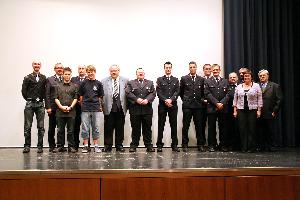 Bürgermeister Fritz Hermann Lutz zusammen mit den Ehrengästen und den in diesem Jahr Beförderten und Geehrten