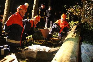 Neben der Halle war eine weitere Person unter einem Anhänger eingeklemmt. Nachdem die Einsatzstelle mit Scheinwerfern ausgeleuchtet war, wurde der Hänger mit pneumatischen Hebekissen angehoben und die verletzte Person den Helfern des DRK übergeben. Diese hatten neben dem Sportplatz in der Zwischenzeit einen Behandlungsplatz eingerichtet und übernahmen die weitere Versorgung.