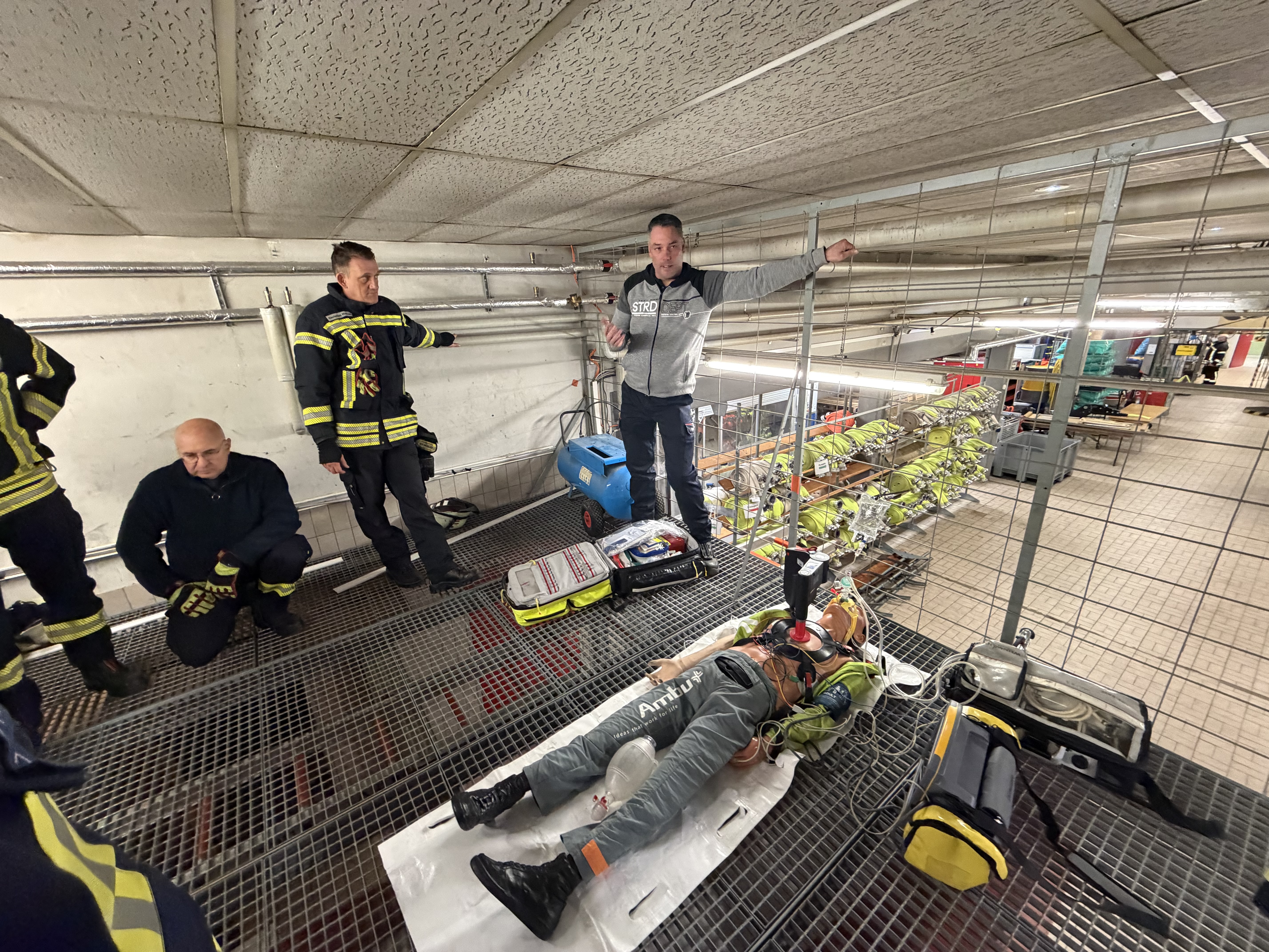 Im praktischen Teil wurden technische Hilfsmittel wie Schaufeltrage und Schleifkorbtrage nochmals vorgestellt, deren Einsatzmöglichkeiten erläutert und die Handhabung geübt. Anschließend galt es, eine Übungspuppe unter Reanimationsbedingungen von einer Bühne patientenschonend zu retten. Hierbei standen insbesondere die enge Abstimmung mit dem Rettungsdienst, ein strukturierter Ablauf sowie eine sichere und zügige Durchführung im Vordergrund.