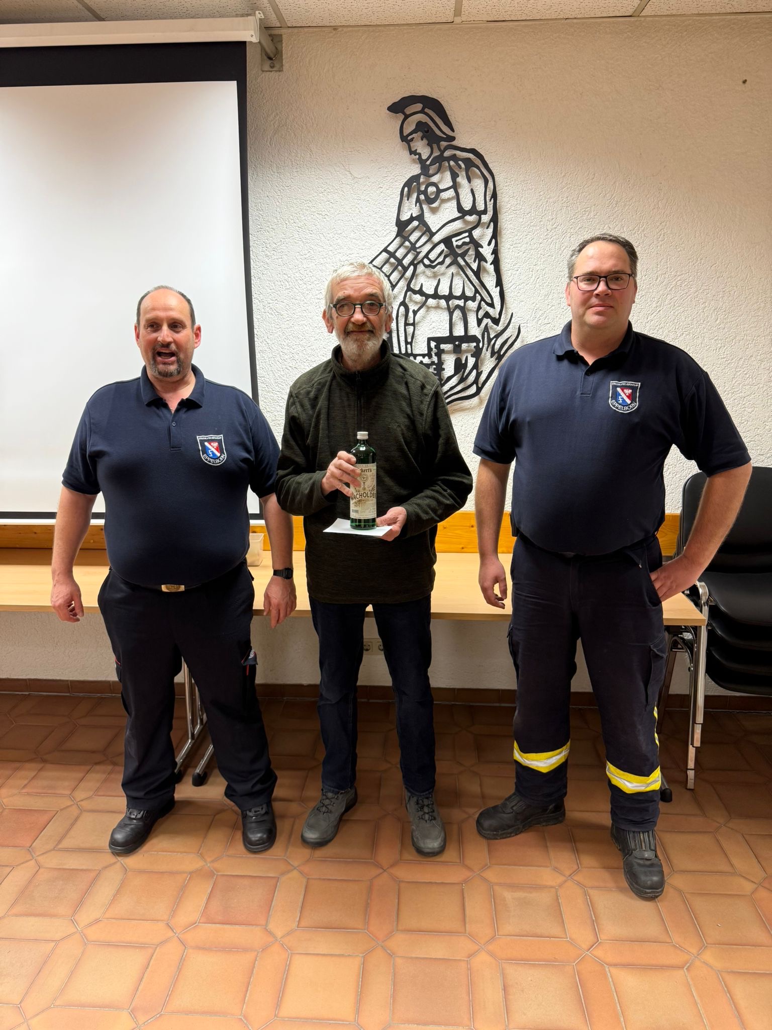 Der Löschbezirksführer Jochen Couturier sowie sein Stellvertreter Georg Fuchs verabschiedeten ihn im Kreis seiner Kameradinnen und Kameraden mit einem Präsent in den Feuerwehr-Ruhestand.