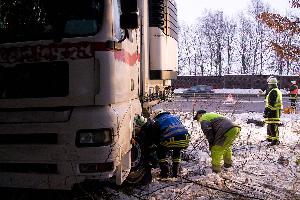 Die Einsatzkräfte der Feuerwehr leuchteten mit den Lichtmasten von Tanklöschfahrzeug und Rüstwagen die Einsatzstelle aus und beseitigten Bäume und Zaunteile, um freien Zugang zum Führerhaus zu schaffen. Mit Bindemittel wurde der Bereich der Dieselkontamination abgestreut, um restlichen Kraftstoff aufzufangen. Ebenfalls mussten die Bergungsarbeiten zum Teil mit technischem Gerät unterstützt werden. Insgesamt dauerte der Einsatz der Feuerwehr rund sechs Stunden.