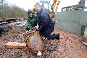 Dirk Otterbein und Werner Fuchs vom Kampfmittelbeseitigungsdienst an der Fliegerbombe