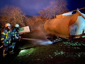 Unverzüglich wurde durch die ersten Einheiten ein Löschangriff aufgebaut um die Flammen niederzuschlagen. Auch ein Trupp unter Atemschutz löschte parallel das Güllefass ab, welches im Bereich der Reifen brannte.