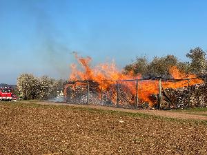Dirmingen. Nur einen Monat nach dem Großbrand auf dem Birkenhof, der die Feuerwehr mehrere Stunden lang gefordert hatte, wurden die Einsatzkräfte am Morgen des 15. April 2021 erneut zu einem Großeinsatz gerufen. Anrufer hatten der Leitstelle auf dem Saarbrücker Winterberg zuvor gemeldet, dass ein Schuppen an einem Feldweg in der Verlängerung der Straße "Ziegelhütte" in Flammen stehen soll.