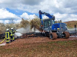 Um nach dem Niederschlagen der Flammen an die Glutnester heranzukommen, wurde die Fachgruppe Räumen des THW aus Spiesen Elversberg nachgefordert. Die Spezialisten des Technischen Hilfswerks brachten einen Bagger zur Einsatzstelle, mit dem die noch brennenden Reste auseinandergezogen wurden, um sie dann ablöschen zu können.