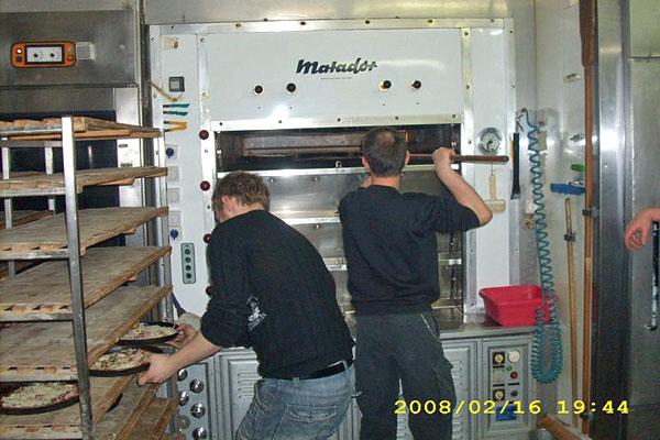 Der Backofen im Feuerwehrgerätehaus wäre mit dieser Menge Pizza natürlich hoffnungslos überfordert gewesen. Deshalb ging's mit dem Rollwagen zur benachbarten Bäckerei Steimer, die die Backstube an diesem Abend den Jugendfeuerwehrleuten überließ. Bäckermeister Steimer ging den Jugendlichen dabei zur Hand, und nach 20 Minuten konnten die fertig gebackenen Pizzas zurück ins Gerätehaus gefahren werden.