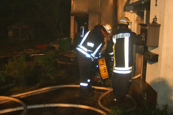 Der Brand hatte bis zum Eintreffen der Feuerwehr bereits auf weitere Kellerräume übergegriffen, eine Holztreppe zum Obergeschoss brannte. Das Feuer drohte bereits auf das Obergeschoss überzugreifen. Während sich die ersten Trupps unter Atemschutzgeräten durch den völlig verqualmten Keller bis zum Brandherd vorkämpften, durchsuchten andere Kräfte die Wohnräume im Ober- und Dachgeschoss sicherheitshalber nach weiteren Personen. Auch von aussen wurde durch das Kellerfenster versucht, den Brand unter Kontrolle zu bekommen.