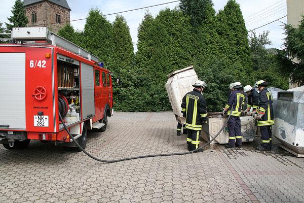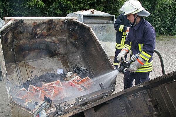 Auch hier wurde das Altpapiergefäß geöffnet und die brennenden Papierreste mit der Schnellangriffseinrichtung des Löschfahrzeugs abgelöscht.