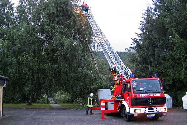 Komplizierter war dagegen ein Einsatz an der Dirminger Borrwieshalle: Hier wurde ein Baum durch die starken Sturmböen entwurzelt. Um die Gefahr des Umstürzens abzuwenden, wurde die Drehleiter aus Illingen angefordert. Stück für Stück konnte aus dem Arbeitskorb der Leiter die Gefahr beseitigt werden.