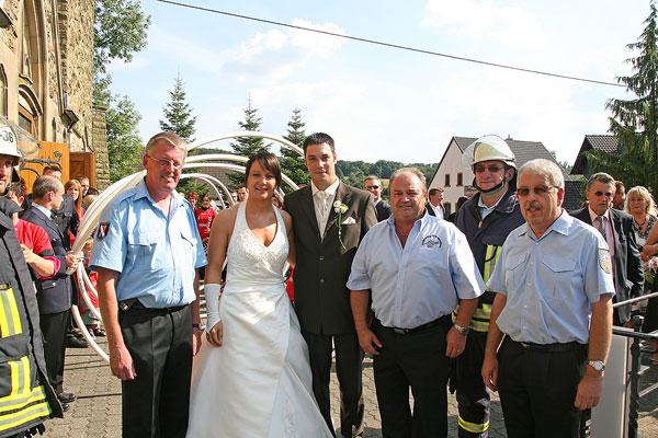 Als das Brautpaar nach dem Brautamt die Kirche verließ, warteten dort bereits der Fanfarenzug und die Kameraden aus dem Löschbezirk Eppelborn. Auch die Arbeitskollegen der Berufsfeuerwehr Saarbrücken waren gekommen und ließen die beiden ein Schlauchspalier durchschreiten. Löschbezirksführer Felix Becker, sein Stellvertreter Günter Klesen und Günter Schmitt vom Fanfarenzug gratulierten dem Brautpaar und überbrachten die besten Glückwünsche der Feuerwehrkameraden.