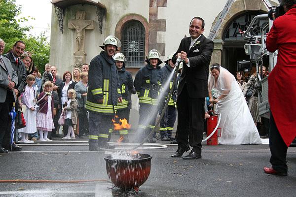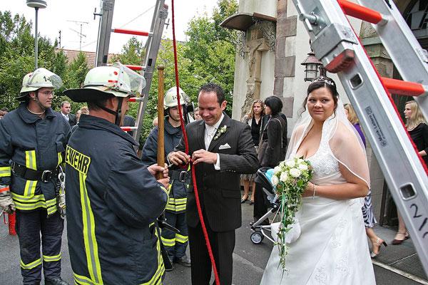 Davon hatte das Brautpaar noch nichts mitbekommen, als es aus der Kirche trat. Und zuerst standen nach alter Tradition noch Feuerwehraufgaben an, die von Braut und Bräutigam erfüllt werden mussten. Mit sicherer Hand befestige Eric eine Feuerwehraxt mit einem Knoten an einer Leine, doch beim anschließenden Einsatz der Kübelspritze bewies Nicole größeres Geschick: Sie konnte die Flammen entschieden schneller löschen, während das Feuer bei Eric immer wieder aufloderte. Mit der Drehleiter aus Illingen fuhr das Brautpaar dann in den siebten (Feuerwehr-)Ehehimmel.