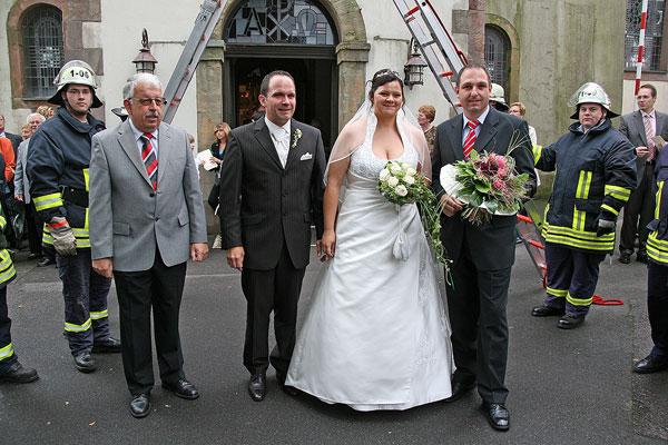 Löschbezirksführer Felix Becker und Kassierer Sascha Müller gratulierten dem Brautpaar im Namen aller Kameraden, bevor die Fahrt mit Blaulicht im improvisierten Brautauto zur Feier nach Humes losgehen konnte.