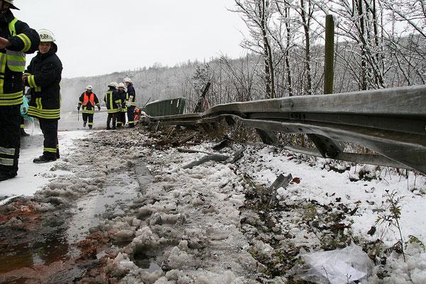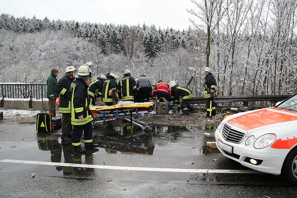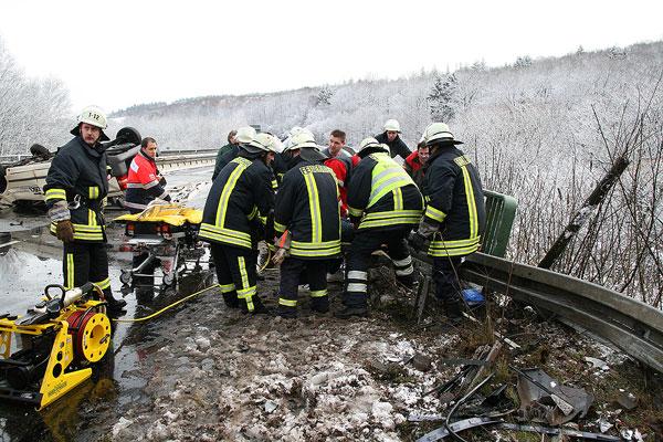 Gegen 11:53 Uhr wurden die Löschbezirke Eppelborn und Bubach-Calmesweiler von dem zuerst vor Ort eingetroffenen Notarzt zur Rettung des eingeklemmten Fahrers nachgefordert. Nach einer medizinischen Erstversorgung durch den Rettungsdienst mussten die Einsatzkräfte die durch den Unfall stark deformierte Leitplanke mit einem hydraulischen Spreizer wegdrücken, um den Patienten schonend befreien zu können. Nach rund 15 Minuten konnte der Schwerverletzte dem Rettungsdienst übergeben werden.