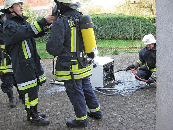 Im Innern der Waschmaschine war es durch einen technischen Defekt unter Rauchentwicklung zu einem Kabelbrand gekommen. Den ersten eintreffenden Einsatzkräften gelang es schnell, den Entstehungsbrand nach Abtrennen der Maschine vom Stromnetz zu löschen. Unter Atemschutz brachte ein Trupp die Waschmaschine ins Freie, wo mit einer Kübelspritze letzte Glutreste abgelöscht wurden.