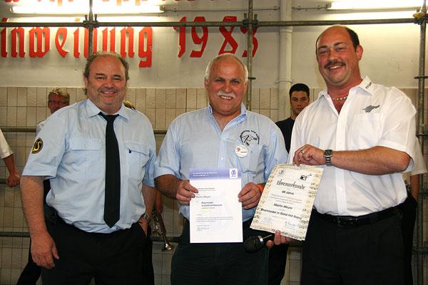 Der Fanfarenzug nutzte die Festlichkeiten, um drei langjährigen Mitgliedern zu danken. Fanfarenzugführer Jörg Olliger überreichte Georg Fuchs für seine langjährige Mitgliedschaft eine Ehrenurkunde. Olliger selbst wurde von Landesstabführer Günter Schmitt mit der silbernen Ehrennadel für 25 Jahre Mitgliedschaft geehrt. Und für ganze 40 Jahre Mitgliedschaft im Fanfarenzug Eppelborn wurde Martin Meyer mit der goldenen Ehrennadel ausgezeichnet.