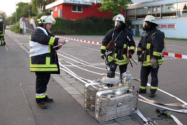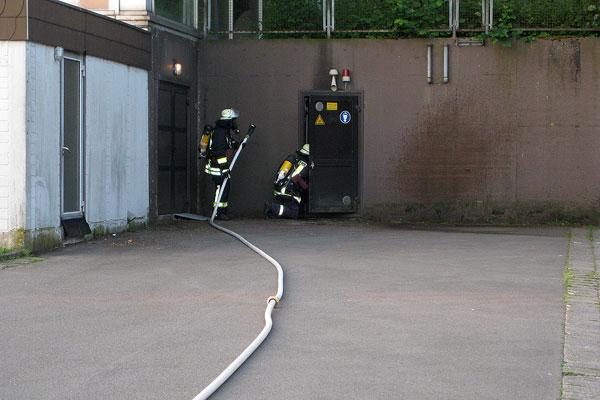 Da keine unmittelbare Gefährdung bestand, wurde auf die Bademeisterin, die über einen Schlüssel zu dem Objekt verfügt gewartet. Ein mit Atemschutzgeräten ausgerüsteter Trupp konnte dann in den Gaslagerraum vorgehen und die Räumlichkeiten kontrollieren. Zum Niederschlagen von etwaigen Chlordämpfen wurde ein Strahlrohr mitgeführt. Die dabei durchgeführten Messungen mit Prüfröhrchen zeigten kein Vorhandensein von Chlorgas in der Luft. Auch im Bereich der Technikräume ergaben die Messungen keinen Nachweis für Chlor.