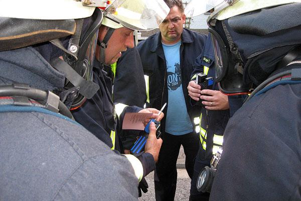 Der Einsatzleiter forderte das ABC-Erkundungsfahrzeug des Landkreises Neunkirchen aus Wustweiler an, das über die notwendige Meßtechnik verfügt. Auch die Führungsgruppe des Gefahrstoffzuges machte sich auf den Weg zur Einsatzstelle. Inzwischen war auch ein Techniker der Firma, die die Anlage betreut, vor Ort eingetroffen. Gemeinsam wurde eine Einsatzleitung gebildet und das weitere Vorgehen geplant.