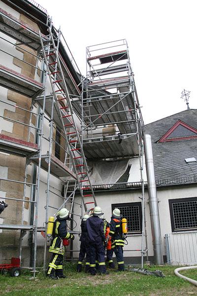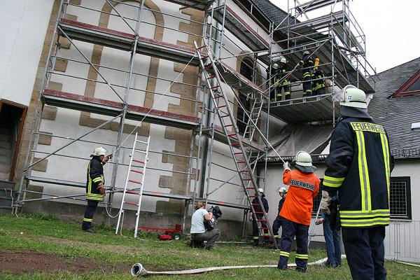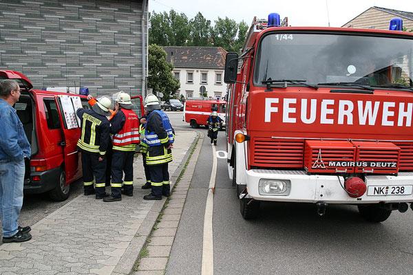 Zahlreiche Schaulustige hatten sich bereits an der Pfarrkirche im Lebacher Stadtteil Thalexweiler versammelt und warteten auf die ersten Helfer. Grund für den Großalarm war ein angenommener Brand im Glockenturm der Kirche. Herabstürzende, brennende Trümmer hatten auch das in unmittelbarer Nähe liegende Pfarrheim in Brand gesetzt, erfuhren die anrückenden Einsatzkräfte von der Einsatzleitung. Von ihr bekamen sie auch ihren jeweiligen Einsatzauftrag.