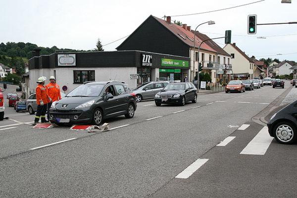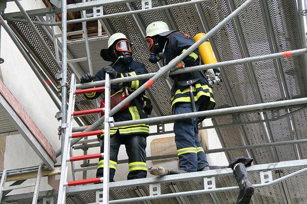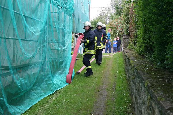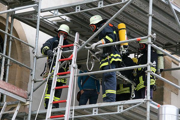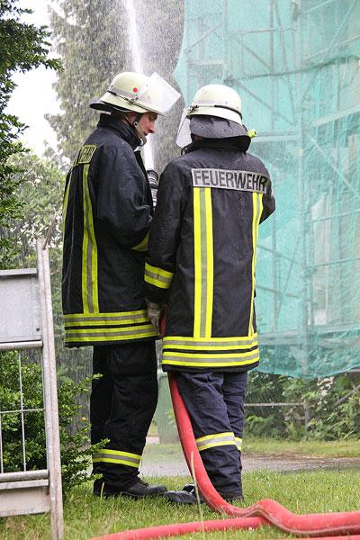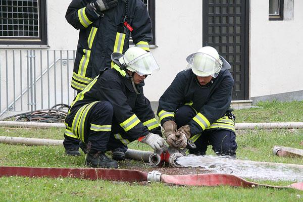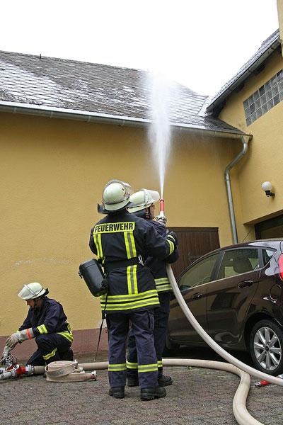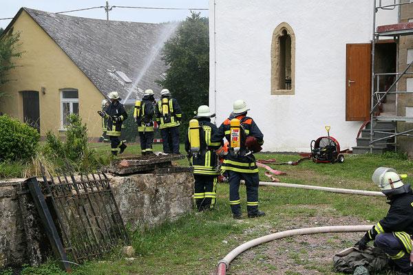Die Aufgaben waren vielfältig: Während die ersten Trupps in den verrauchten Glockenturm der Pfarrkirche vordrangen, musste auch das Pfarrheim nach eingeschlossenen Personen abgesucht werden. Denn fünf Menschen wurden in den brennenden Gebäuden vermisst. Vor allem aber musste eine zusätzliche Wasserversorgung aus der Theel bis zur Einsatzstelle aufgebaut werden. Dabei wurden Schlauchleitungen auch über die stark befahrene Ortsdurchfahrt gelegt.
