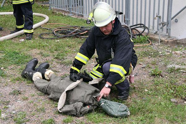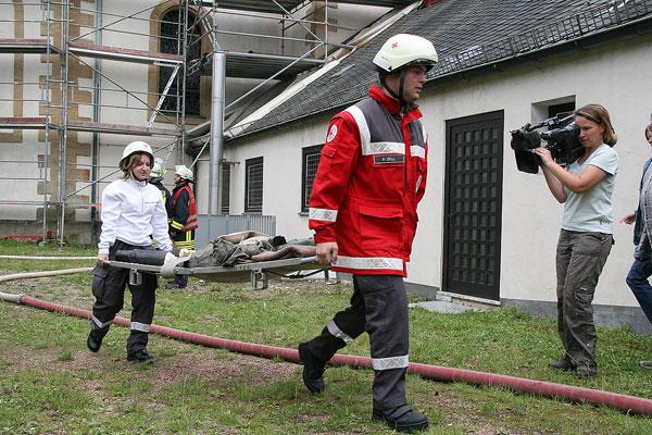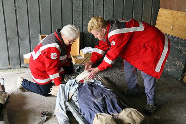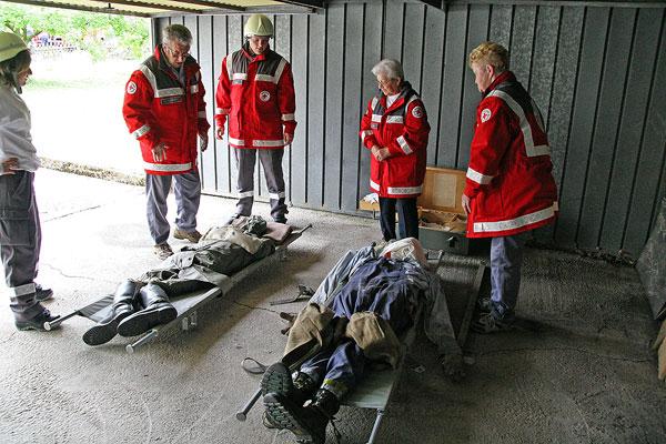 Die geretteten Peronen, die von den vorgehenden Trupps schnell gefunden wurden, wurden den Helfern des DRK übergeben, die ebenfalls zur Übung angerückt waren. Sie hatten in einer Garage eine Verletztensammelstelle eingerichtet und übernahmen dort die weitere medizinische Versorgung.