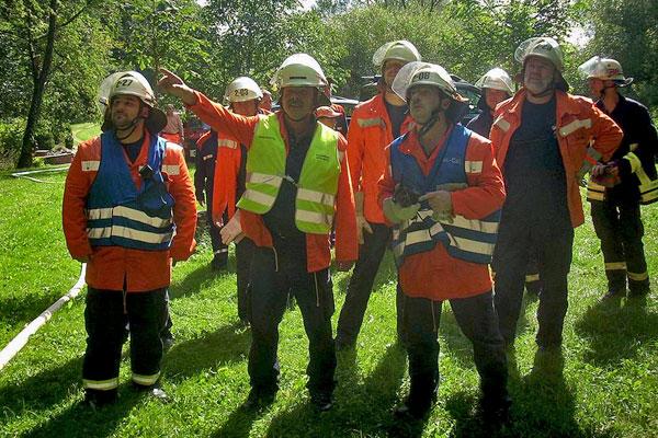 Im Laufe der Löscharbeiten wurde vom Einsatzleiter der sofortige Rückzug befohlen, da der simulierte Brand durchbrach. Sofort verließen die Einsatzkräfte ihre Positionen und sammelten sich an ihren Fahrzeugen. Jetzt erfolgte eine neue Befehlsausgabe der Einheitenführer. An einer schmalen Stelle im angenommenen Schadensgebiet wurde ein Durchbrechen des Feuers durch massiven Wassereinsatz verhindert. Somit war das Übungsziel erreicht.