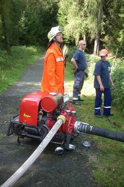 Es musste eine unabhängige Wasserversorgung von einem angrenzenden Weiher in Richtung der Einsatzstelle nahe der Kapelle aufgebaut werden. Die Wasserentnahme wurde mit der Tragkraftspritze des LF 16/TS durchgeführt. Im weiteren Verlauf wurden durch das Personal des LF 16/TS mehrere C-Rohre zur Brandbekämpfung vorgenommen.