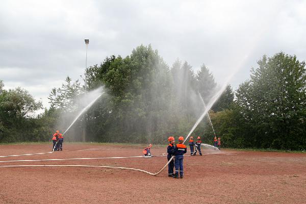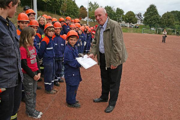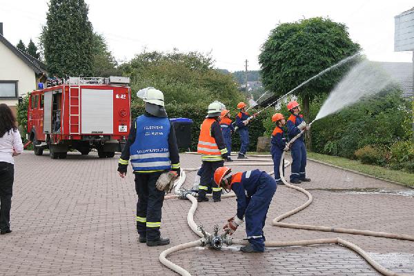 Zahlreiche Besucher waren gekommen und interessierten sich für die Übung der Jugendlichen. Auch Ortsvorsteher und Gemeinderatsmitglieder waren vor Ort und verschafften sich selbst ein Bild über die sehr gute Jugendarbeit der Feuerwehr in der Gemeinde. Lobesworte gab es beim gemeinsamen Antreten nach der gelungenen Übung von Wehrführer Hermann Josef Recktenwald und Gemeindejugendwart Karl Paul.