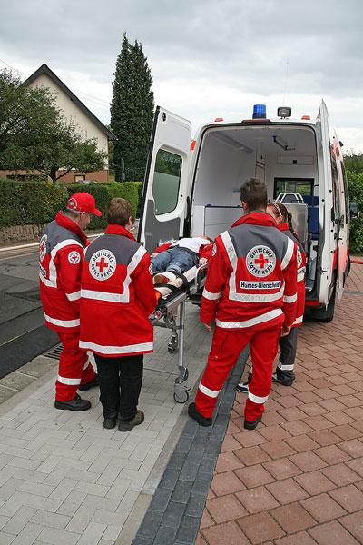 Nach und nach werden die Jugendfeuerwehrleute in den einzelnen Löschbezirke alarmiert und eilen mit Blaulich und Martinshorn zur Einsatzstelle. Lange Schlauchleitungen müssen von den Hydranten zur Einsatzstelle verlegt werden, bevor mit zahlreichen Rohren der Löschangriff beginnt. Mehrere Personen werden gerettet und von den Helfern des Jugend-Rotkreuzes Hierscheid/Humes versorgt.