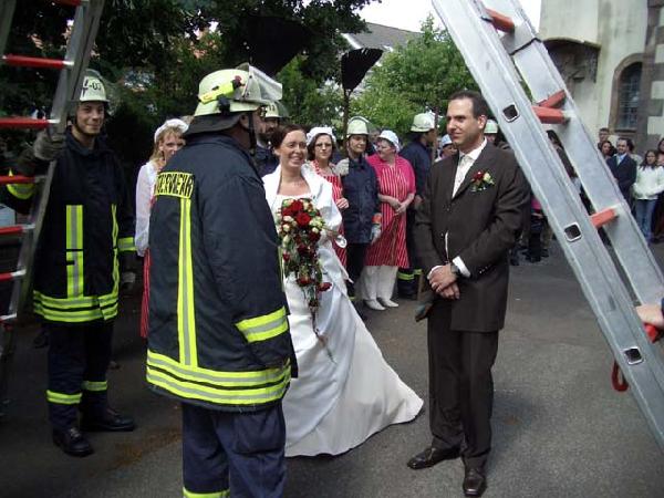 Im Anschluß an die Messe wurde das frischgetraute Brautpaar vor der Kirche bereits erwartet. Feuerwehrkameraden und erstmalig auch die Küchenfrauen standen Spalier, als die beiden durch das Kirchenportal traten. "Frauenbeauftragter" Sascha musste seine Ehetauglichkeit noch einmal durch fachmännisches Anbringen eines Knoten mit der Feuerwehrleine unter Beweis stellen, was nach Zudrücken mancher Augen und nach einigen Anläufen auch gelang.