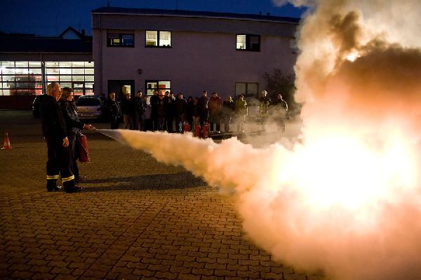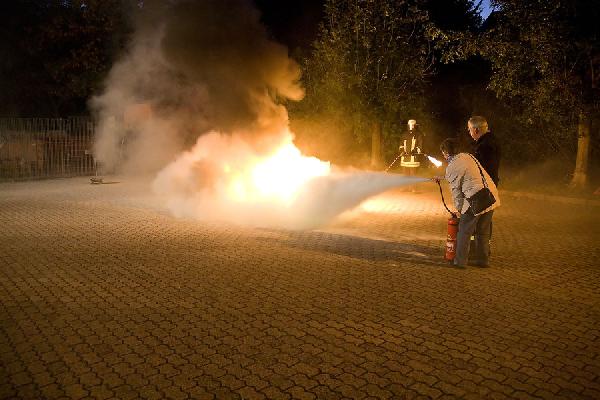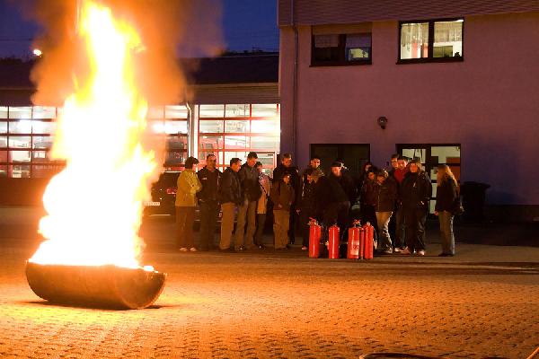 Im anschließenden praktischen Teil konnte dann der Einsatz eines Feuerlöschers in der Praxis erprobt werden. Dazu hatte die Feuerwehr ein Übungsfeuer und zahlreiche Feuerlöscher vorbereitet, an denen die Teilnehmer der Schulung üben konnten.