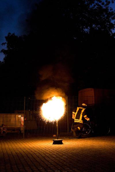 Eppelborn. Meterhoch schießt die Stichflamme in den Himmel vor dem Feuerwehrgerätehaus in Eppelborn. Gerade hat ein Feuerwehrmann versucht, brennendes Öl mit Wasser zu löschen und dabei eine gefährliche Fettexplosion ausgelöst. Kein Unfall, sondern Teil der Brandschutzausbildung, die am 14. Oktober 2009 für Pflegekräfte des Seniorenheims St. Josef bei der Feuerwehr in Eppelborn stattfand.
