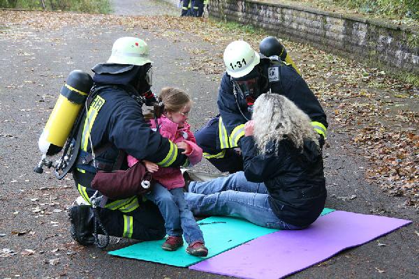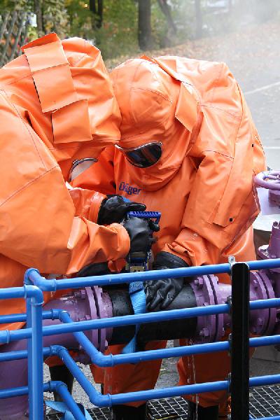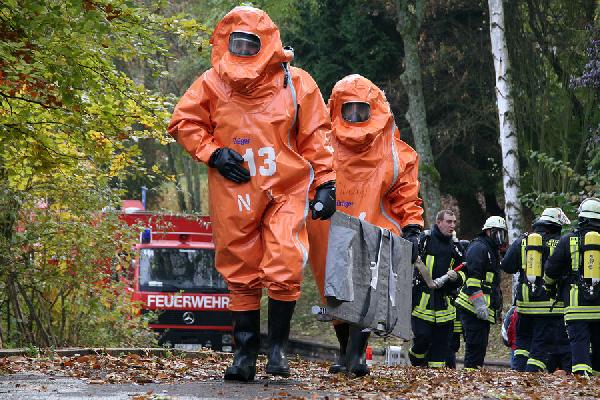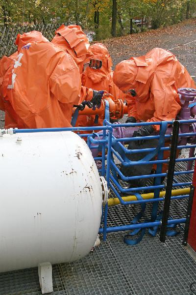 Doch um welche Chemikalie es sich genau handelt und welche Gefahren von ihr ausgehen ist wegen der ständig wechselnden Produktion zu diesem Zeitpunkt noch unklar. Deshalb wird die Einsatzstelle zuerst weiträumig abgesperrt und ein Trupp mit Atemschutzgeräten ausgerüstet. Dieser soll die Lage erkunden und die Verletzten schnellstmöglich aus dem Gefahrenbereich herausbringen.