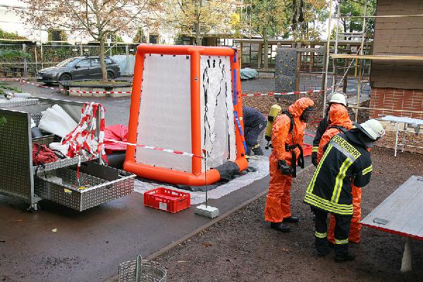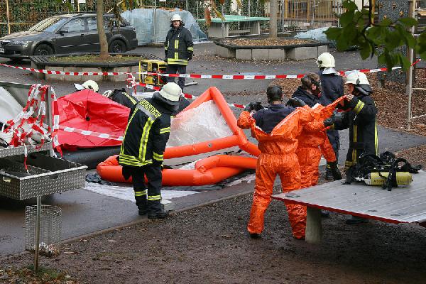 Für die Übung wurde der Schulhof der Realschule in Eppelborn kurzerhand zum Chemiewerk umfunktioniert: Um eine realistische Situation zu schaffen, wurde die Gefahrstoffsimulationsanlage der Landesfeuerwehrschule aufgebaut. Rauch und Flüssigkeit trat aus dem Rohrsystem aus und sorgte so für eine echt wirkende Darstellung des Zwischenfalls.