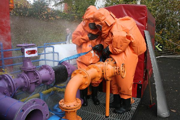 Als die Spezialisten eintreffen, sind bereits vier der Verletzten in Sicherheit gebracht worden, doch zwei Arbeiter liegen noch immer in der beschädigten Anlage, aus der die gefährliche Flüssigkeit noch immer austritt. Nachdem sie sich mit speziellen Schutzanzügen ausgerüstet haben, können die Trupps auch die beiden letzten Personen retten und mit dem Abdichten der Leckagen beginnen. Auch die Gefahr, die von der Flüssigkeit ausgeht, steht inzwischen fest: Sie ist brennbar und entwickelt giftige Dämpfe.