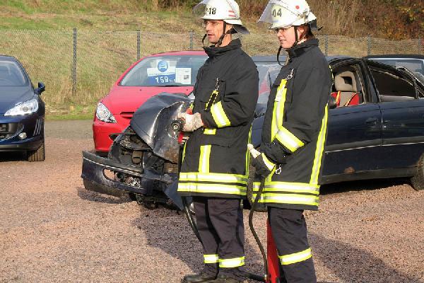 Als Übungsobjekt stand ein PKW, besetzt mit einer Puppe zur Verfügung, der mit ca. 60 km/h gegen einen Baum geprallt war. Dieser Zusammenstoß wurde unter Regie eines Sachverständigenbüros von der Waagerechten in die Senkrechte übertragen. Das heißt, der PKW wurde an einem Autokran ca. 15 Meter in die Höhe gezogen und dann auf den auf dem Boden liegenden Baumstamm herunterfallen gelassen. Nach dem Aufprall auf den Baumstamm blieb das Unfallfahrzeug auf dem Dach liegen.