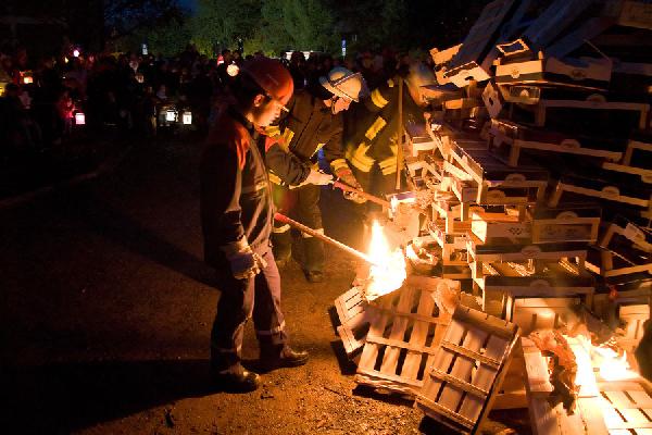 Denn die hatten auf dem Schulhof bereits zahlreiche Holzkisten für das große Martinsfeuer zusammengetragen und aufgeschichtet, als die ersten Zugteilnehmer mit ihren Laternen eintrafen. Nachdem Pastor Marx das Zeichen gegeben hatte, wurde das Feuer entzündet.