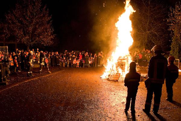 Die Besucher bestaunten das große Martinsfeuer, das mit hellen Flammen in der Dunkelheit niederbrannte. Im Anschluss gab es für die Kinder die ersehnten Martinsbrezeln und Kinderpunsch, für die Eltern wärmenden Glühwein.