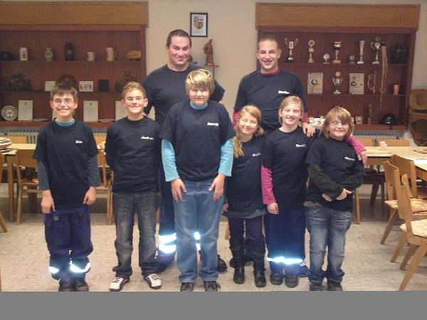 Als Geschenke brachte der Weihnachtsmann für jeden ein neues T-Shirt mit Namen und einen Kalender der Jugendfeuerwehr mit. Stolz präsentieren hier die jungen Kameraden ihre Geschenke.