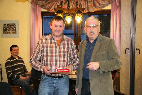 Im Namen aller Angehörigen des Löschbezirks überreichte Schriftführer Eric Holzer jeweils einen Gutschein an Löschbezirksführer Felix Becker und seinen Stellvertreter Frank Schwan. Er dankte den beiden damit für die Mehrarbeit, die sie oft hinter den Kulissen übers Jahr leisten und von der viele nichts mitbekommen.