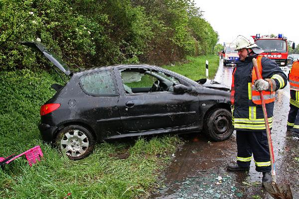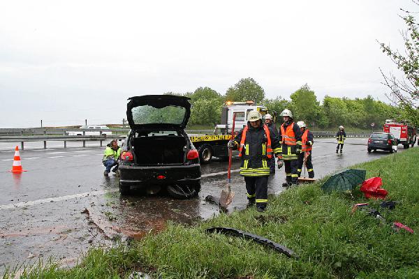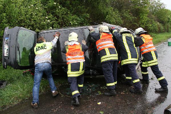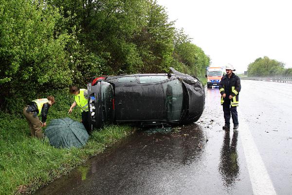 Dirmingen. Auf regennasser Fahrbahn kam am Morgen des 01. Mai 2010 die Fahrerin eines Kleinwagens auf der Autobahn A1 zwischen den Anschlussstellen Eppelborn und Tholey von der Fahrbahn ab, überschlug sich und blieb auf der Seite auf dem Standstreifen liegen.