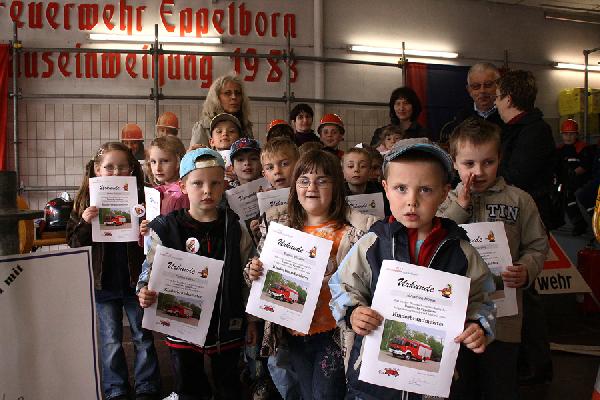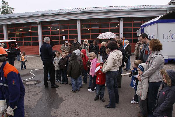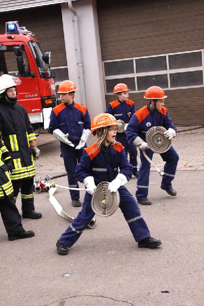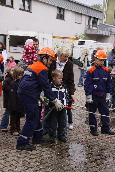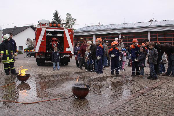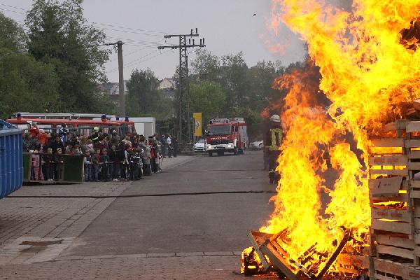 Ein richtig großes Feuer gab es dann im Anschluss zu bestaunen, als die Jugendfeuerwehr mit Blaulicht und Martinshorn zu einer Schauübung anrückte. Gespannt verfolgten die zahlreichen Besucher, wie der Feuerwehrnachwuchs die Schläuche ausrollte und mit Unterstützung ihrer Betreuer die Flammen löschte. Auch der Einsatz von pneumatischen Hebekissen wurde im Rahmen einer technischen Rettung vorgeführt.
