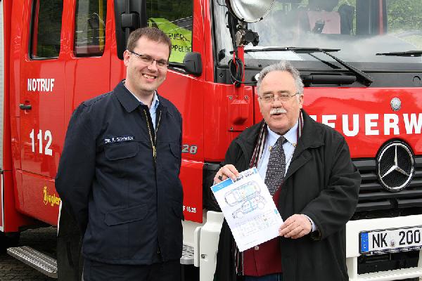 Während zahlreiche Besucher das Angebot in Anspruch nahmen, konnte der stellvetretende Löschbezirksführer Dr. Frank Schwan auch Bürgermeister Fritz Hermann Lutz den Sinn der Rettungskarten erklären und ihm gleich ein persönliches Exemplar aushändigen. Zusammen mit der Rettungskarte überreichte er auch einen Aufkleber für die Windschutzscheibe, der darauf hinweist, dass sich eine Rettungskarte an Bord befindet.