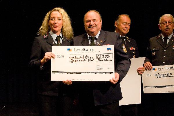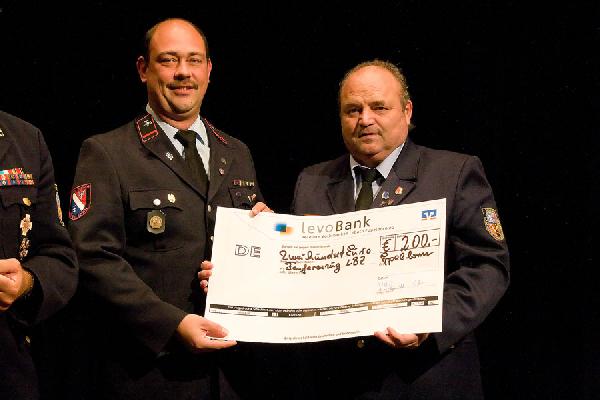 Unter großem Beifall überreichte der Vorsitzende des Fördervereins Günter Schmitt Schecks zur Unterstützung der Feuerwehrarbeit im Löschbezirk. So erhielten die Einsatzabteilung 100 Euro, jeweils weitere 200 Euro gingen an die Jugendfeuerwehr, die Alterswehr und den Fanfarenzug.