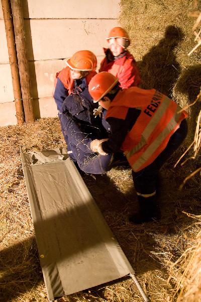 Dabei war vor allem das Ausleuchten der Einsatzstelle von besonderer Bedeutung, denn auf dem abseits gelegenen Hof war es stockfinster. Schnell hatten die Jugendfeuerwehrleute Scheinwerfer aufgebaut und die Lichtmasten der Einsatzfahrzeuge in Stellung gebracht. Während der Löschangriff auf die Scheune aufgebaut wurde, begannen andere Trupps mit der Suche der Verletzten in der Dunkelheit.