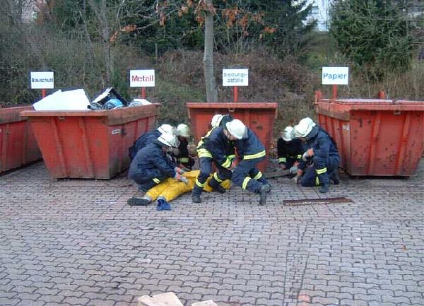 Neben den Themen Metallbearbeitung, Retten aus Notlagen und Ausleuchten der Einsatzstelle war auch eine kleine Hilfeleistungsübung zu bewältigen. Eine Übungspuppe musste gerettet werden, die unter einen abgerutschten Container geraten war. Mit einfachen Einsatzmitteln, die auf allen Feuerwehrfahrzeugen mitgeführt werden, wurde diese Einsatzaufgabe von der Lehrgangsgruppe sehr gut gelöst.