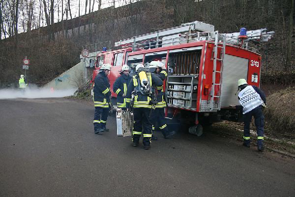 Die Sicht im Tunnel war durch den Rauch, den eine Nebelmaschine erzeugte, so stark beeinträchtigt, dass man selbst 3 Meter vor dem Tunnelausgang ins Freie noch nicht einmal Licht sehen konnte. Mit einem Druckbelüfter wurde der Tunnel dann rauchfrei geblasen. Die beiden Übungsleiter waren mit der Leistung zufrieden und bedankten sich für die Unterstützung aus Bubach-Calmesweiler.