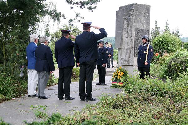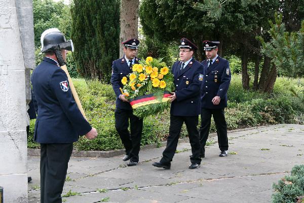 Mit einer Kranzniederlegung auf dem Friedhof am Samstag Abend gedachten die Mitglieder der Einsatzabteilung zusammen mit der Jugendfeuerwehr und der Altersabteilung sowie Vertretern von DRK und DLRG den verstorbenen Kameraden. Begleitet wurde der Zug dabei vom Fanfarenzug Eppelborn.