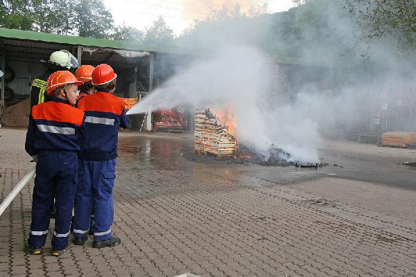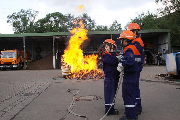 Auch die Jugendfeuerwehr hatte einen großen Auftritt: Vor zahlreichen Zuschauern rückten sie mit Blaulicht und Martinshorn an, um ein richtiges Feuer zu löschen. Besonders die jungen Zuschauer waren dabei "Feuer und Flamme" und bestaunten mit großen Augen die Übung.